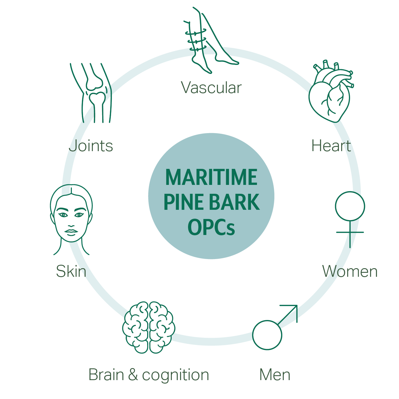 Maritime pine bark extract, concentrated in OPCs, offers a unique profile distinct from other sources like grape seed extract, due to its specific composition and origin. Well-known for their potent antioxidant activity, and ability to scavenge free radicals, OPCs from pine bark help to reduce oxidative stress and support various physiological functions. Clinical studies have shown that pine bark extract contributes to a wide range of health benefits including joints, vascular, cardiovascular, metabolic, brain, skin, and gender-specific health, making it a valuable supplement for overall well-being across the adult lifespan.