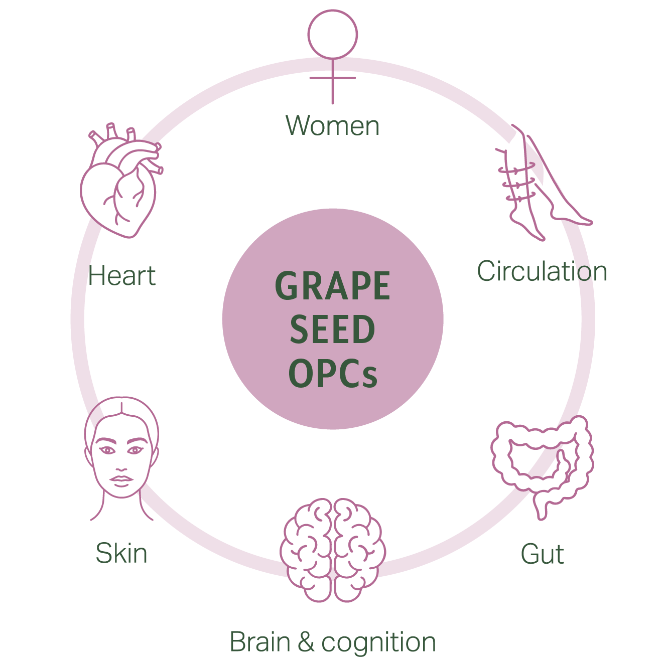Les extraits de pépins de raisin, qui contiennent des OPC, sont réputés pour contribuer à l’activité antioxydante, aidant à éliminer les radicaux libres et donc à réduire le stress oxydatif. De nombreux bienfaits pour la santé sont associés à la supplémentation en OPC, allant de la santé cellulaire au bien-être général, comme le rapporte la littérature scientifique. Ceux-ci comprennent des bienfaits pour la santé vasculaire, la santé cérébrale et cognitive, la santé de la peau, la santé des femmes, la santé intestinale et la santé cardiaque.