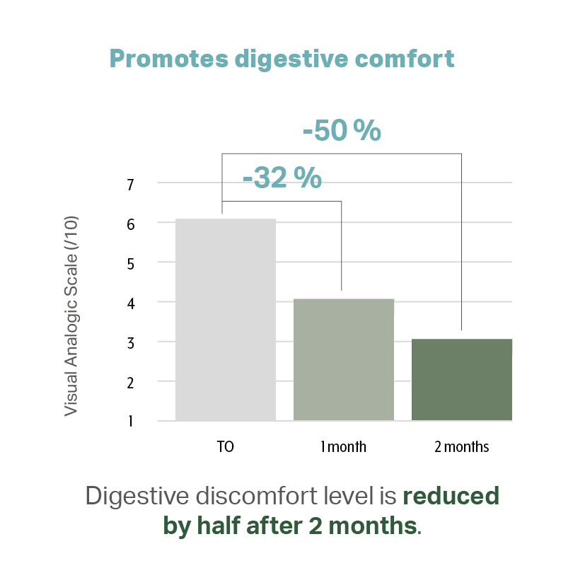*Étude randomisée contrôlée contre placébo chez l’homme sur 130 volontaires présentant un inconfort gastro-intestinal, 500mg/jour pendant 2 mois.(n = 65 – Placebo = 65)